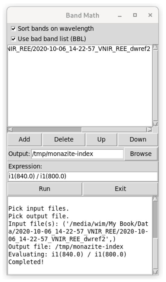 To name a few, QUANTools was implemented using the ENVI/IDL programming language for the automatic detection of multiple absorption feature parameters []. However, to run QUANTools, a runtime version of ENVI/IDL is needed, and the QUANTools package offers limited functionality, similar to one specific tool in HypPy, which is called the wavelength mapper.