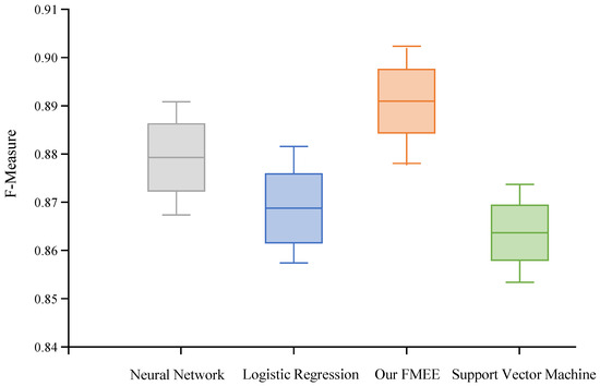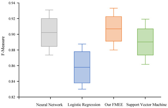 Furthermore, we extend our experimentation to a more densely populated urban region within the northwest Chinese city. Figure 3 illustrates the F-measure evaluations derived from 30 independent tests conducted across the four comparative algorithms. On a comprehensive scale, our proposed FMEE attains an F-measure of 0.891, surpassing baseline methodologies such as neural networks, logistic regression, and support vector machines by margins of 0.013, 0.023, and 0.028, respectively.