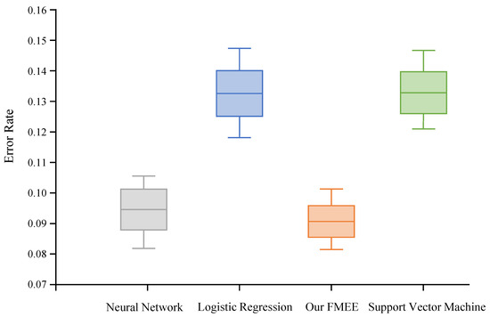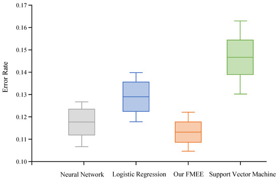 To facilitate a comprehensive comparison among the four algorithms, Figure 2 depicts the error rate and F-measure of fault outage prediction results in the form of line and box charts. Notably, FMEE emerges as a frontrunner, showcasing a substantial advantage over the sophisticated support vector machine in terms of error rate. Specifically, our FMEE achieves an average error rate of , surpassing the neural network, logistic regression, and support vector machine by margins of , , and , respectively. These findings underscore the clear superiority of our proposed FMEE methodology.