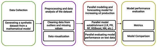 Figure 1 shows the research process to predict the oil recovery factor based on parallel machine learning algorithms, which includes four main stages. The first stage is the collection of a synthetic dataset from the mathematical model. In the second stage, the preliminary processing and analysis of the resulting dataset is carried out. The third stage then involves parallel modeling and predicting the oil recovery factor using machine learning techniques. Finally, in the fourth step, the performance of the model is evaluated to determine its effectiveness.