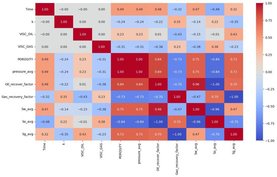 The gas recovery factor exhibits a strong negative correlation (−0.73) with porosity and pressure, implying that in scenarios where porosity and pressure are high, the gas recovery factor tends to be lower. The average water saturation shows a near-perfect negative correlation (−0.96) with the average oil saturation, which is expected as increases in one typically result in decreases in the other within the reservoir.