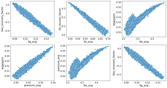 From the scatterplots, some variables exhibit linear relationships. For instance, porosity has a positive linear relationship with pressure. Conversely, the oil recovery factor has a negative linear relationship with oil saturation and the gas recovery also has a negative linear relationship with gas saturation.