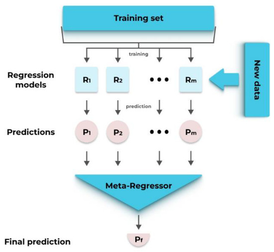 Stacking regressor is an ensemble method that combines the predictions of multiple underlying regression models to improve the predictive power. It works by training a secondary model that uses the base models’ predictions as the input. By learning to weigh the predictions of diverse models, the stacking regressor aims to achieve higher accuracy than any individual model. Figure 5 shows the architecture of the stacking regressor.