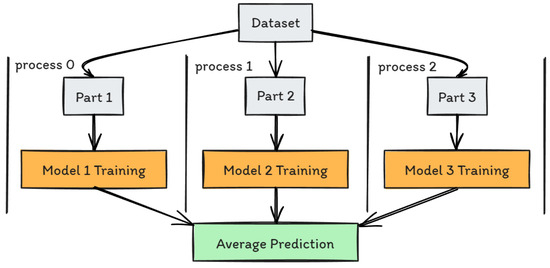 The parallel learning of machine learning models and neural networks can be divided into two main approaches: data parallelism and model parallelism. Data parallelism implies dividing the dataset into the nodes of a parallel computing system and training independent models on each node on its own sub-datasets. Each model independently performs forecasting, and the final solution is the average of all the models. Parallelizing a model involves distributing different computations across multiple nodes, with each node processing part of the overall task. Despite the distribution of tasks, all nodes contribute towards solving a unified model. The end goal is to efficiently solve a single, coherent model by leveraging the computational power of multiple nodes simultaneously. For small datasets, there is a risk of the loss of accuracy with data parallelism. However, by maintaining optimal accuracy and getting enough acceleration, using data parallelism can be useful. A visual diagram of data parallelism can be seen in Figure 7.