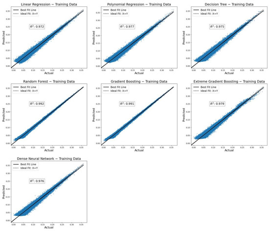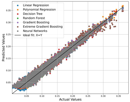 Analyzing the performance of various machine learning models on training datasets revealed the following key observations. First, most models, including linear regression (LR), polynomial regression (PR), decision tree (DT), random forest (RF), gradient boosting (GB), and extreme gradient boosting (XGBoost), demonstrate high accuracy in both the training and test data, exceeding the threshold value of 0.97. This indicates the high generalization ability of these models, which can be seen in Figure 9 and Figure 10. The neural network (NN) also achieves high accuracy on both datasets, although it was slightly lower compared to the other models.