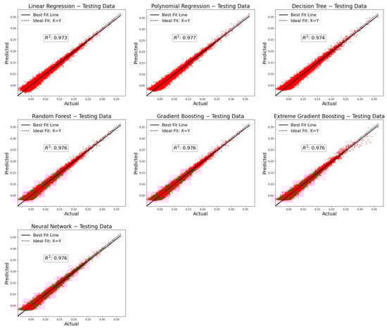 Figure 10 shows the actual and predicted results for the regression models based on the testing data. This graph clearly demonstrates the models’ ability to generalize beyond the training set. The models show comparable coefficients of determination , indicating that they are effective at capturing the underlying patterns in the data, even when exposed to new, unseen data. Remarkably, the PR model achieved a high value of 0.977, effectively capturing the nonlinear relationships among the variables. The remaining models showed results of about 0.974, which are also very high. These results highlight the ability of both traditional algorithms and advanced machine learning techniques, including neural networks, to achieve high prediction accuracy and maintain consistency across different pieces of data.