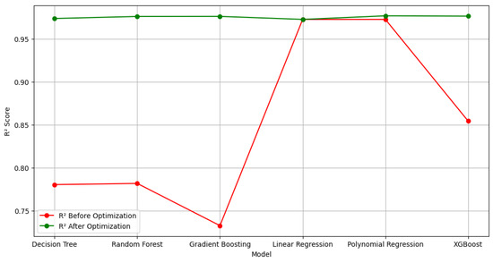 It can be seen that decision trees, random forest, gradient boosting, and extreme gradient boosting showed a great improvement after being optimized, increasing their score by more than 10% at least. This means that, once optimized, these models are better at adjusting for changes in the data and can make more accurate predictions than the original values. These results confirm that optimizing the models can significantly improve their performance and make them more reliable for use in predictive models.