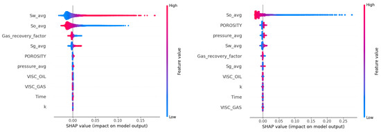 The features are ranked in order of the importance in influencing the model’s output from top to bottom. The water saturation has the highest impact, followed by the oil saturation and gas recovery factor for the linear regression model, whereas, for the decision tree model, only the oil average shows a significant impact.