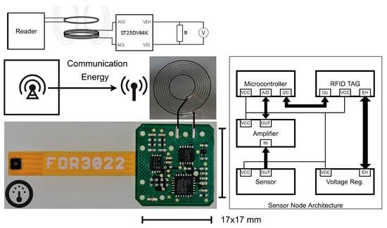 Figure 1. After the sensor node is integrated into the plate, no software updates or maintenance can be applied. The communication with the micro-controller takes place only via the NFC tag. The communication is bidirectional, originally via the NFC tag’s EEPROM (code and data). Alternatively, wireless communication can be realized directly with a write-through mode (because the lifetime of the EEPROM is limited to about 1000–10,000 write cycles), writing message data directly to the micro-controller. The sensor node uses an ARM Cortex STM32 L031 device, an NFC tag with a power supply, and a pre-amplifier for piezoelectric sensors. The features are summarized in