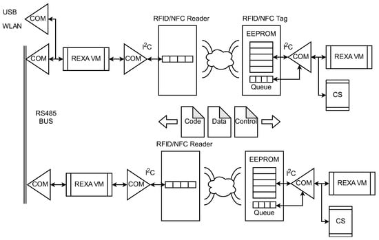 Although this work focuses on the design and implementation of a universal VM suitable for implementation on very low-resource embedded systems and providing ML as a programmable service, communication aspects are relevant and must be considered as constraints, both for the design and operation of the VM and the communication design. Communication with material-integrated sensor nodes is commonly performed by using wireless technologies, but in the presence of metals and dielectric materials, wireless communication is a challenge. Low- and mid-frequency RFID technologies are widely used. In this work, it is assumed that the REXA VM is accessible by RFID/NFC communication, as shown in