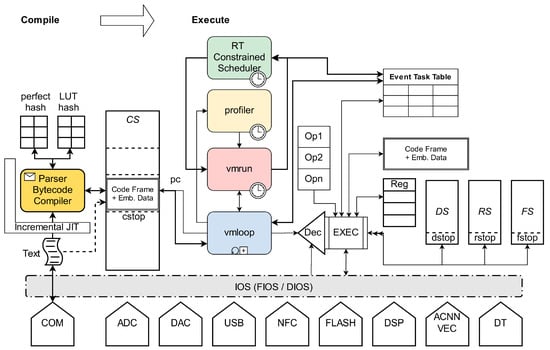 Figure 3 shows the architecture design of the REXA VM and its interoperability with the closely coupled just-in-time (JIT) compiler. The JIT compiler depends on the VM ISA, which can be freely defined, although this work is strongly related to the Forth programing language. The architecture details depend on the configuration (single- or multi-tasking, number of stacks, and customized extensions and accelerators). The principle architecture is equal for software and hardware implementations. Profiling is an optional feature used for predictive real-time scheduling, as well as the energy-aware real-time scheduler.