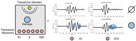 18]. A transmission GUW experiment commonly utilizes two transducers, one generator (pitch signal), and one sensor (catch signal). The generator signal was a sine wave of base frequency 40 kHz and a Gaussian mask window (5 cycles). The simulation was carried out with a time step of 0.06 μs, a total of 5000 steps (300 μs), with each tenth step recorded. In total, 7 × 6 damage positions were simulated. Circular damage (air, 30 mm diameter) placed at a specific center location (