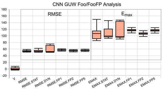 Figure 15 shows the comparison of the prediction results of the continuous Foo and discretized and scaled FooFP model for the regression tasks. The prediction delivers the damage position coordinates, and a non-damage detection is given by a (0,0) value pair (or close to). The RMSE and maximal position prediction errors are computed. Results for static and dynamic scaling were compared. The summary of results is as follows: