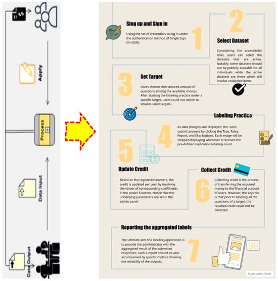 The provision of labeled datasets in the most efficient possible way is of paramount importance to enhance the categorization capacities of machine learning methods, particularly supervised learning [1,2]. Data labeling systems and applications are enabling tools to steer annotation practices through the cooperation of a large number of volunteers conducting a set of minor tasks. Herein, the volunteers are called individuals, contributors, users, crowds, and/or workers, while the microtasks include common labeling activities such as identifying and marking specific facets of images. For instance, as illustrated in the literature, user experience is essential to designing efficient and adaptable interactive industrial Internet of Things systems [3]. Using the wisdom and cognitive ability of an undefined network of individuals to respond to an open call is also denoted as crowdsourcing [4,5,6]. Generally, crowdsourced data labeling refers to the process of assigning tags to raw data (such as images or text) by leveraging the contributions of a large group of people, often through online platforms.