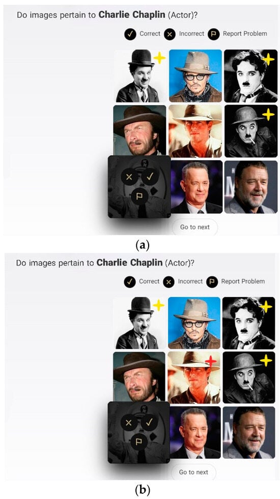 In Figure 2a, three golden images (whose pictures include yellow stars) require submitting a True sign. In Figure 2b, a negative-type golden image is also defined, namely, the second image in the second row displaying a red star. In this case, the correct answer implies choosing the False (×) sign. Thus, the whole score cannot be obtained by selecting only True icons. We transform the original formulation into Relation (2) by distinguishing the type of golden items and introducing the type of indicator parameter (i.e., ). This expression doubles the number of coefficients relative to the original function, distinguishing between the bonuses assigned to the positive and negative golden items. We allow for different values of the coefficients assigned to the negative golden items. For instance, the administrator could increase the penalty rate of users who submit incorrect answers to negative items and allow it to approach zero, imposing a severe loss on the credit function.