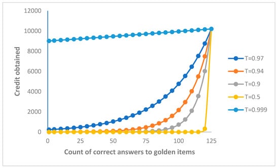 Figure 3 illustrates the values taken by the credit function for different levels of the shape parameter as the number of correct answers to the golden items increases. To efficiently assess the behavior of the function, the key assumption is to ignore incorrect labels to the golden items. That is, users either submit the correct answer or skip the questions. For example, a value of 100 in the horizontal axis indicates that out of 125 golden items available, 100 labels have been correctly submitted while the other 25 questions were skipped. This figure intuitively describes the influence of T on the distribution shape of the credit function. An inappropriate tuning of T flattens the increasing trend of the credit function, conditioning the subsequent behavior of users. For instance, and represent extreme cases illustrating this feature. When , the outputs of the credit function are approximately zero even if 123 out of 125 golden questions have been correctly answered. Note the considerable jump that occurs when the user correctly labels the last two golden items.