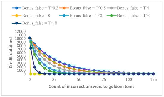 Clearly, when all labels are assigned correctly, the credit function hits the ceiling of 10,204. The strict requirements of the original formula can be smoothed by introducing counterpart values through the inverse form of , namely, the positive power of T. As the number of incorrect answers approaches 0, the function converges to the default setting while divergencies increase with the number of incorrect answers. Consider the case with 25 incorrect labels and 100 correct ones. When equals 0, 0.994, 0.985, 0.97, 0.941, 0.913, and 0.737, outputs are given by 0, 4091.88, 3256.2, 2225.14, 1039.08, 485.23, and 2.35, respectively. The data labeling system administrator must select the appropriate penalty, ranging from a strict , to a more lenient one, .