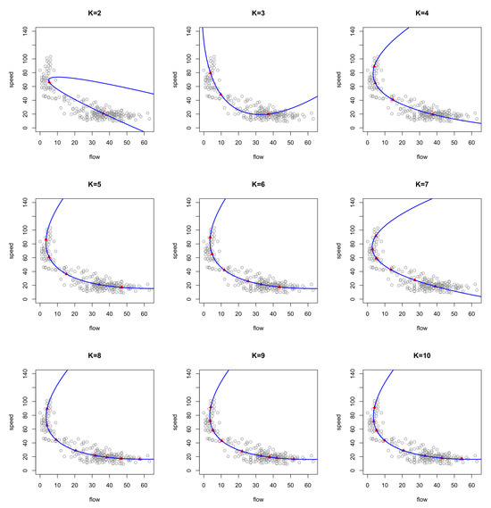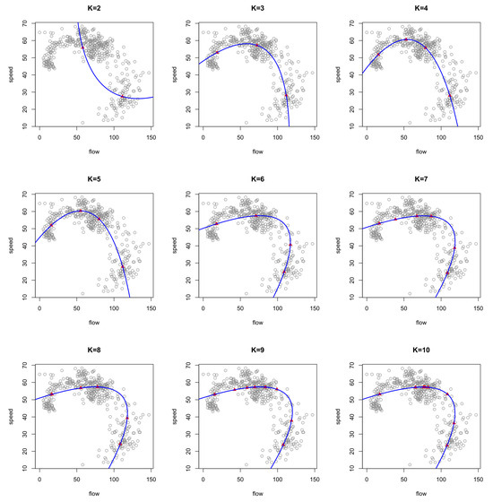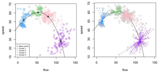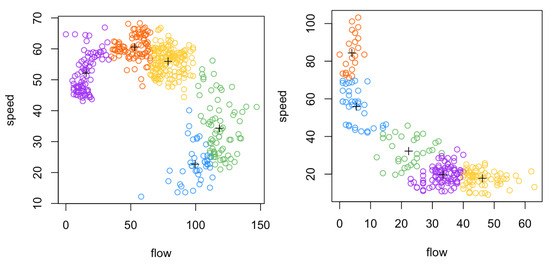 The left panel in Figure 1 shows the clustering of the calspeedflow dataset through K-means with five clusters (as in [25]) using the kmeans function available in R. While the clusters appear nicely lined up along the data cloud, it is important to note that they are not actually ordered—neither K-means nor any other commonly used clustering algorithms inherently provide a method for arranging the clusters in any ordered relationship with each other. In this paper, we follow the approaches of both [24,26], and analyze such data directly in speed-flow space, combining the notions of curvilinear approximation and clustering.