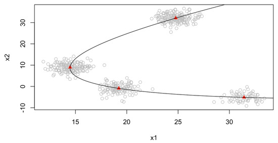 We define a directed clustering algorithm as a clustering process in which the ordinal relationship of the resulting cluster labels is well-defined; that is, one can say that cluster is larger (or smaller) than cluster k in a meaningful way. In order to include directional information in the clustering process, one needs to connect the clustering problem with the concept of a latent variable. The idea is to assume the existence of such a latent variable, which parameterizes a curve through m-variate space, passing through . Since the latent variable is one-dimensional, it enables an ordering relation along it, which can then be inherited by the cluster centers ‘sitting’ on it and, hence, to their corresponding cluster labels. A suitable latent variable model that can used to achieve this purpose was recently proposed by [16], who suggested approximating highly correlated multivariate data through the use of a one-dimensional latent space, i.e., a straight line, which is parameterized by a single random effect. An estimation of this model was carried out through the nonparametric maximum likelihood approach [17], which is based on a mixture model approximation that facilitates the clustering step. This model achieves clustering of the data and dimension reduction simultaneously. The work by [16] did not introduce the notion of ‘directed’ clustering, so one novel contribution of the present manuscript is to introduce and implement this concept. However, importantly, it is clear that most data structures are not exactly linear (such as the ones in Figure 1); hence, as a second novel contribution, in this manuscript, we also extend the approach in Ref. [16] to quadratic latent variable models. We propose an algorithm to simultaneously select the number of clusters and choose between a linear and a quadratic latent variable model, and a second algorithm to carry out the actual directed clustering based on this model choice.