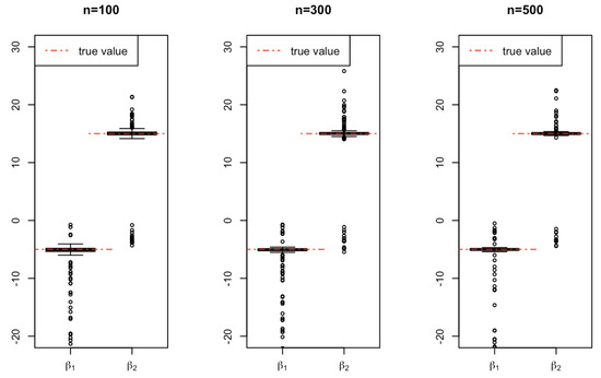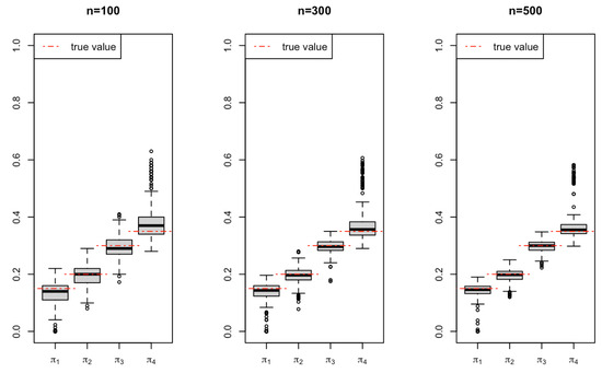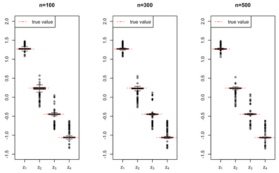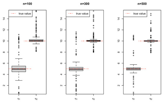The averaged estimates are shown in Table 1, and boxplots of the estimates for some of the parameters are provided in Figure 3, Figure 4, Figure 5 and Figure 6. Firstly, we observe that as the sample size increases, the boxplots squeeze towards the true values for each parameter, indicating empirically the consistency of the proposed estimation procedure. For the , this is less clearly visible, since even at , the interquartile range (IQR) is already very small.
