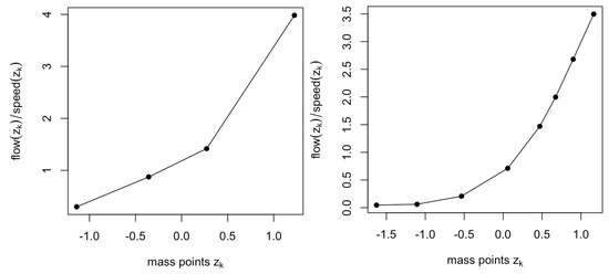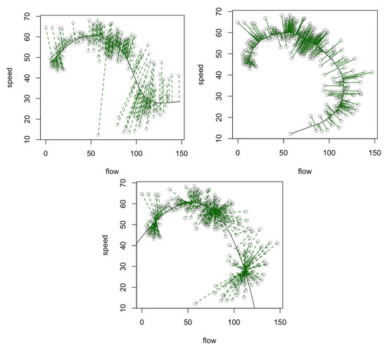 Additional features and insights can be obtained from the output (iv) of Algorithm 2. Specifically, we can obtain the posterior random effect through the use of [33], where represents the posterior probabilities for each observation. The can serve as one-dimensional summary information for the and can be used for ranking purposes. The right-hand panels in Figure 9 and Figure 10 show the resulting projections, i.e., the segments connecting with , along the fitted curve for the respective datasets. In practice, it means that each observation (each 5-min interval of speed- and flow values) can be immediately associated with a specific cluster, corresponding to a certain operating condition at the measured location. This information could then be used by intelligent transportation systems to take appropriate action, or perhaps just to flag a ‘congestion score’ (in the form of the current cluster label) to relevant road management authorities.