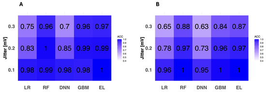 Accuracy heat maps of different machine learning algorithms in difference detection of ECG patterns displaying ST segment depression (A) and Long-QT syndrome (B) using three increasing identical Gaussian jitter values (0.1 mV, 0.2 mV, 0.3 mV). ACC, accuracy; DNN, deep neural network; EL, ensemble learning method; GBM, gradient boosting machine; LR, logistic regression; mV, millivolt; RF, random forest.