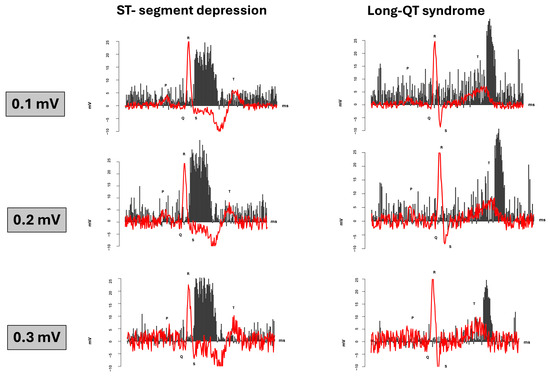 Electrocardiographic (ECG) signal analysis allows the identification of heart function and integrity [1]. The offline identification of distinct ECG changes as indicators of different pathologies has been one of the cornerstones of both cardiovascular and non-cardiovascular medicine for decades [2,3]. However, besides the traditional 12-lead ECG interpretation in clinical cardiology, there are numerous other clinical situations where ECG changes are continuously monitored [4]. For example, the use of wearable devices for cardiovascular monitoring including ECG has gained significant interest and clinical value for patients and healthcare workers [5]. Despite recent technological advances, certain limitations continue to compromise the accuracy of signal interpretation, potentially leading to imprecise pathology detection. These lead to missing variances of the ECG morphology due to multiple confounders such as internal or external artifacts, the low resolution of monitors used, the impossibility of analyzing changes of the signal obtained on the fly, and the general problem of inaccuracies of ECG traces and intervals [6]. Computer-aided algorithms might serve as promising tools to overcome these shortcomings. However, most of the technical solutions used so far in clinical practice suffer from low sensitivities in detecting subtle changes, particularly in noisy ECG signals [7,8,9,10].