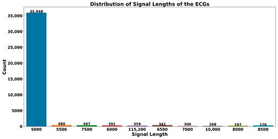 Figure 1 shows the distribution of ECG signal lengths in the dataset. The figure shows that 95% of the ECG signals in the dataset have a length of 5000 samples. The remaining 5% of the ECG signals have lengths that range from 5500 to 115,200 samples.