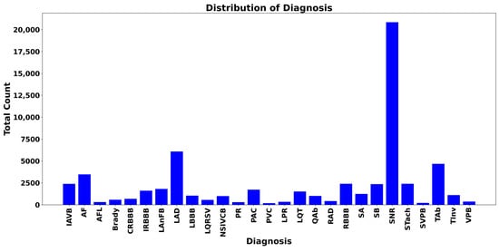 Figure 2 visualizes the distribution of cardiac abnormalities in the utilized datasets. The vertical axis represents the number of abnormalities, and the horizontal axis lists the names of the 27 classes in abbreviated form. The abbreviations used, corresponding to the Diagnosis and SNOMED CT codes, are provided in Appendix A, Table A1. It is worth noting that “Sinus Rhythm (SNR)” appears as the most frequent abnormality in the graph.