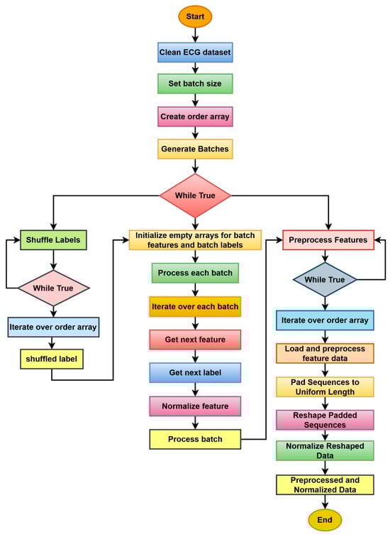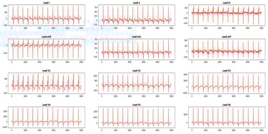 As a result, the model learns more robustly, and all characteristics are normalized on an identical scale across the training phase [,]. We produce batches of preprocessed features and shuffled labels continually by executing these processes recursively within the generator function. The machine learning model is now able to train on the information we have provided for accurate ECG signal classification in medical applications with ease due to our carefully developed preprocessing steps, which successfully tackles the issues posed by our sizable and varied ECG dataset. The preprocessing technique utilized in this work is presented in the form of a flow chart in Figure 3, and Figure 4 presents the segmented and preprocessed 12-lead ECG signals.