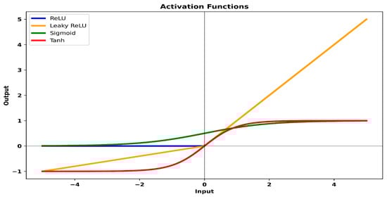The activation functions also have a very essential responsibility in designing deep learning models. The selection of the activation function depends upon the types of input data and the category of classifications. In this work, we utilized Leaky ReLU and ReLU activation functions, and we compared these with the most commonly used activation functions, sigmoid and tanh, as visualized in Figure 6.