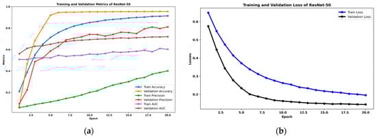 The ResNet50 model, developed in 2015 by Kaiming He et al. [], which introduced the concept of the residual block, contains 50 layers and is capable of resolving the vanishing gradient problems in deeper networks. The residual block is mathematically defined as , where  is the CNN output within the block and  is the input. This model introduced the concept of skip connections and allows the gradient to pass directly through these connections. It also introduced bottleneck design in its structure of the residual blocks consisting of 1 × 1, 3 × 3, and 1 × 1 Conv layers. The 50 layers in the ResNet50 model with residual blocks enable the capture of more complex patterns. However, its limitation is the high computational cost due to its complex and deep structure.