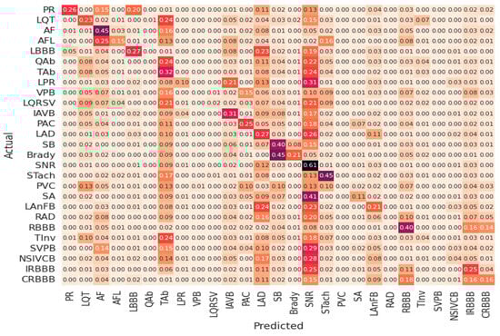 The ECG dataset used in this study was obtained from the PhysioNet/CinC Challenge 2020 database [,]. The dataset consists of 66,361 ECG recordings, of which 43,101 are for training, 6630 for validation, and 16,630 for testing. To train the model efficiently, we utilized the 43,101 training recordings and split them into training and validation sets in a 90:10 ratio, resulting in 38,790 training samples and 4311 validation samples. To ensure rigorous model evaluation and prevent data leakage, we opted to partition the provided training dataset (excluding the designated validation set of 6630 recordings) into separate training and validation subsets. This approach allowed for robust model training and hyperparameter tuning without compromising evaluation integrity. For testing, we used an undisclosed hidden dataset of 10,000 recordings, which has different sampling frequencies.
