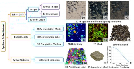 Components in synthetic ballast dataset. Left: Architecture of the synthetic ballast dataset. Right: Examples of various data categories within the synthetic ballast dataset []. (a–c) 2D synthetic ballast images under different lighting conditions. (d) 3D heightmap. (e) Masks of ballast particles for 2D synthetic ballast images. (f) 3D point cloud of ballast particles. (g) Labels of ballast particles for 3D ballast point clouds, each 3D point is rendered in a specific color that indicate the ballast particle it belongs to. (h) 3D completed mesh of a ballast particles. (i) Ballast particle size distribution curve.