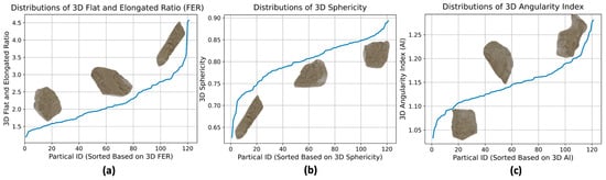 Morphological characteristics of the scanned meshes of individual ballast particles. Distributions of (a) 3D flat and elongated ratio (FER), (b) 3D sphericity, and (c) 3D angularity index (AI) [].