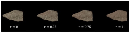 When employing adaptive texture mixing, the texture of ballast particles was combined with that of the fine material through a randomly generated noise mask, guided by input parameter ‘r’. This parameter ‘r’ is related to the percentage of the particle surface area covered by fine materials. Figure 5 illustrates the progressive alteration in the rendering of a ballast particle as ‘r’ increases during the texture-mixing step depicted in Figure 4h.