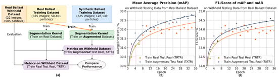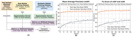 Figure 8a provides a detailed illustration of the configuration of the experiment and its execution flow. Two distinct training datasets of ballast images were created to independently train a ballast segmentation model (Cascade Mask R-CNN with a Swin- Transformer as the backbone []) using identical network configurations. The first dataset included a subset of collected real ballast images, as described in Section 3, comprising 325 images with a total of 50,461 ballast particle instances. The second dataset consisted of a subset of synthetically generated ballast images, detailed in Section 4, containing 325 images with a total of 128,139 particles. After 36 training epochs, both segmentation models were tested using the same ballast dataset, which was randomly selected from the real-image dataset and not included in the training sets. This reserved real dataset comprised 22 images with 3505 ballast particles and was used as the testing dataset to assess and compare the performance of the two models after training.