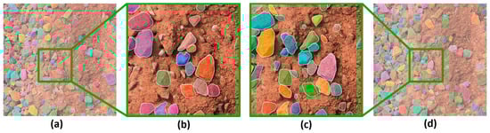 Segmentation results on a real ballast image. (a) Ballast segmentation results obtained from the model trained exclusively on real ballast images and (b) zoom-in view. (c) Ballast segmentation results derived from the model trained using augmented ballast images and (d) zoom-in view. Different colors indicate different ballast particles detected.