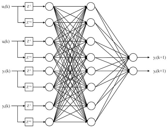where , ,..., are nonlinear functions. ANNs are widely used in signal processing, pattern recognition, data fitting, analysis, and control due to their ability to learn and represent mathematical descriptions of systems []. This can be either Single-Layer Networks (SLNs) or Multi-Layer Networks (MLNs). SLNs, in particular, have been extensively applied to reconstruct the mapping function , resulting in more accurate NARX models in different applications [,,,]. Therefore, this approach was adopted in our work. Figure 1 depicts the conventional configuration of a NARX−NN model. Combining the past inputs and outputs into a single vector :