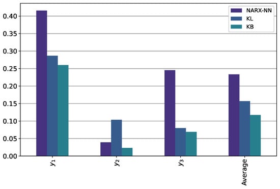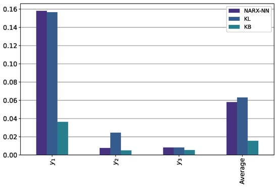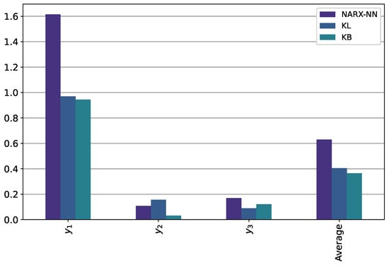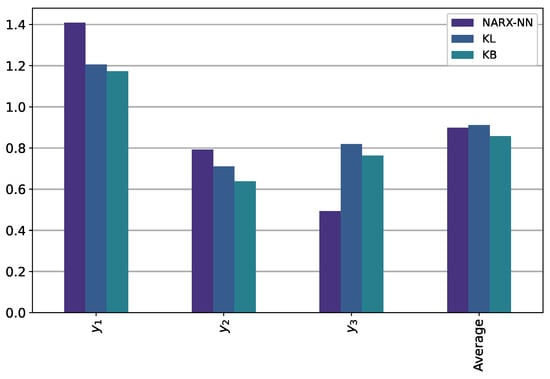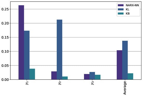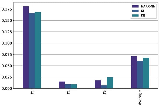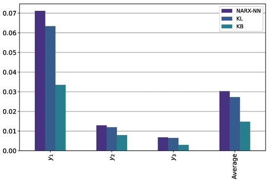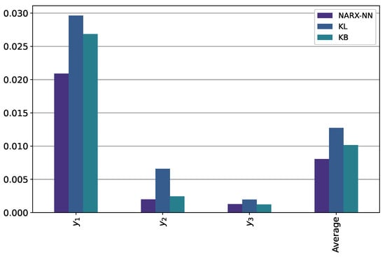 The results based on the training dataset are summarized in Figure 4, and those for the test datasets are provided within Figure 5, Figure 6, Figure 7, Figure 8, Figure 9, Figure 10 and Figure 11. The plots in Figure A1, Figure A2, Figure A3, Figure A4, Figure A5, Figure A6, Figure A7, Figure A8, Figure A9, Figure A10, Figure A11, Figure A12, Figure A13, Figure A14, Figure A15, Figure A16, Figure A17, Figure A18, Figure A19, Figure A20, Figure A21, Figure A22, Figure A23 and Figure A24 in Appendix A depict the predicted outputs (, , ) vs. the actual values for each case. As can be noticed from Figure 4, the NARX−NN model had the lowest average MSE (0.0081) on the training dataset, suggesting that NARX−NN fitted the training data well and indicating good initial performance in the identification of the CDU. In comparison, the KB model performed slightly better than the KL model, where the latter showed the highest average MSE of 0.0127. However, across all test scenarios, KB consistently achieved superior performance with the lowest average MSE, indicating better generalization ability and robustness in capturing the dynamics of the CDU across different experimental conditions. The KL model performed competitively with KB and often outperformed NARX−NN. While benefiting from exogenous inputs and past outputs is powerful for NARX−NN, it also adds more complexity to the model. This may be sensitive in terms of model parameters and can lead to overfitting, causing poorer generalization in capturing the dynamics under different experimental conditions.