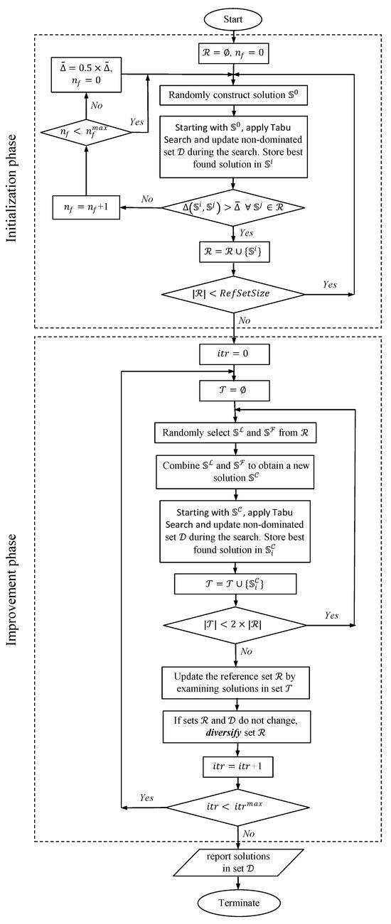Scatter search is a population-based metaheuristic that was introduced by Glover [39]. It utilizes problem-specific neighborhood search and solution-recombination functions, which provide intensification and diversification mechanisms, to iteratively update a set of reference solutions, denoted as . Solution quality and diversity are essential characteristics for solutions to be included in . In multi-objective optimization problems, the set can partially include the non-dominated solutions that are found and updated throughout iterations. The first application of the scatter search to multi-objective optimization problems was for the proctor assignment problem by Martí et al. [40]. For non-linear optimization problems, early competitive results for multi-objective scatter search implementations include Nebro et al. [41] and Beausoleil [42].