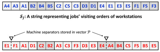 For , each sub-string corresponds to a job, and its size equals the number of operations of that job. To facilitate the visual identification of sub-strings, alternating grayscale colors are used in Figure 2. For instance, for the job labeled with the letter E, there are four elements in its sub-string. The order of the elements (operations) given in the job labeled with the letter C, for instance, indicates that job C will visit workstations in the order of 2, followed by 5, followed by 3. Accordingly, the upper string shown in Figure 2 can be directly interpreted into the vector of permutations expressed as = = = , , , , , , as in [29]. Having sub-strings with fixed sizes in the proposed chromosome structure entails that moves or exchanges of the elements as part of the search procedure of a metaheuristic will be conducted only within a sub-string; meanwhile, inter sub-string moves or exchanges are not allowed.
