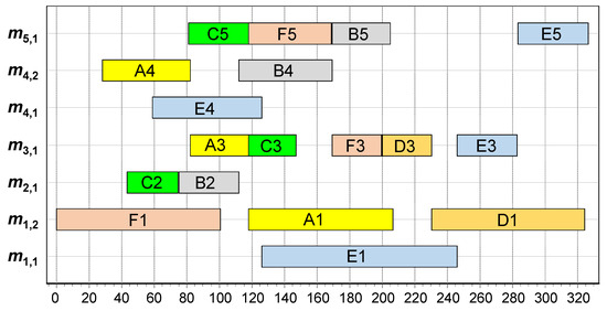 Figure 3 shows the Gantt chart of the schedule generated for the solution representation shown in Figure 2 when Algorithm 1 is applied. Note that a feasible schedule generated via Algorithm 1 is semi-active, meaning that the start time of an operation cannot be set earlier without changing the processing order within its assigned machine and/or changing its job’s visiting order to its required workstations [46]. The set of semi-active schedules includes optimal solutions for many objective functions, including the ones considered in this paper. In addition, the following proposition states an important property for the relationship between the input chromosomes of Algorithm 1 and the generated schedules.