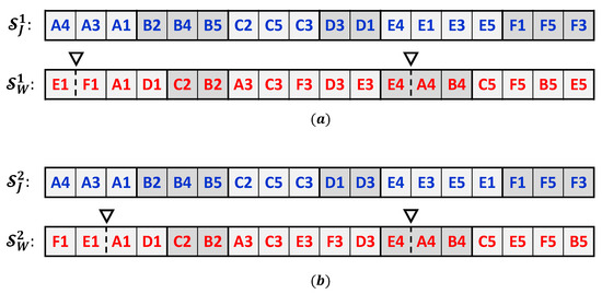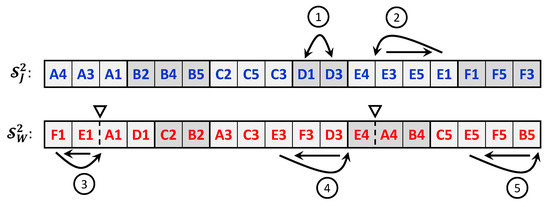 The proposed VPB chromosome structure, denoted as , is constituted of two strings— and —and a vector of integer values, denoted as , representing locations in the string . The two strings are composed of sub-strings of fixed sizes, and each sub-string is composed of elements that refer to the operations to be scheduled. Figure 2 represents the chromosome structure of a solution to the considered sample instance of the studied problem. Each operation is represented by a letter that refers to its job label, as given in Table 2, followed by a number that refers to its processing workstation, as provided in Table 1. As shown in Figure 2, the two strings that constitute the chromosome structure include (the upper string), which corresponds to the orders by which jobs visit the workstations, and (the lower string), which corresponds to the operations’ processing sequences in the workstations. Meanwhile, the vector defines locations for separators that divide the workstations’ sub-strings into divisions representing the processing sequences on the machines.