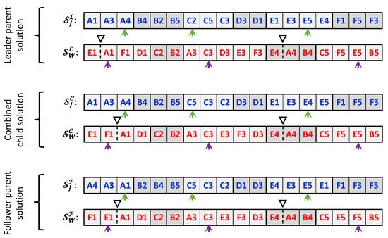 When , genes in the child solution’s sub-string are inherited from both parents’ sub-strings as follows. First, an integer number, , is randomly generated from a discrete uniform distribution, where ℓ is the length (number of genes) of the sub-string. Figure 6 represents the randomly generated positions using a small arrow underneath the sub-strings. Then, genes from the leader solution’s sub-string are copied to the child solution’s sub-string, starting from the first gene up to the gene in location . Afterward, starting from location , the remaining genes are inherited from the follower parent using the same sequence they appear in that parent. Positions of the machine separators are inherited as-is from the parent having the larger number of inherited genes in the corresponding workstation’s sub-string, where tie-breaking is done randomly.