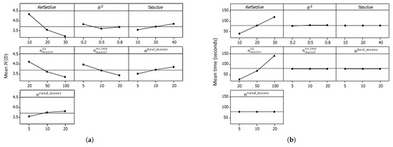 Main effect plots from the first MOSS-tuning experiments. (a) Main effect plots for . (b) Main effect plots for the computational time.