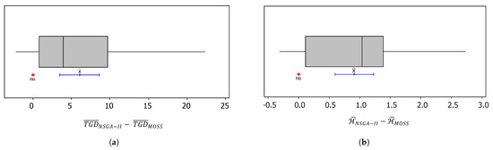 As illustrated in Table 5, the developed MOSS resulted in better in 25 instances. Similarly, for , MOSS resulted in better values in 25 instances. For both metrics combined, MOSS resulted in better values in 23 instances versus only 3 for NSGA-II. As an overall average performance for the 30 instances, the average TGD of MOSS was 12.84, compared to 18.90 for NSGA-II, and the average percentage hypervolume deviation of MOSS was 1.83, as opposed to 2.74 for NSGA-II. To statistically compare these results, a paired t-test was conducted on and . The paired t-test was suitable for this comparison since the experiments were conducted on the same group of MOSS instances, and the calculated averages were approximately normally distributed due to the central limit theorem. Figure 9 shows the box-and-whisker plots for the mean differences of both metrics, along with the confidence interval at a 95% confidence level of the null hypothesis (). Here, is stated as the difference of the means equaling zero.