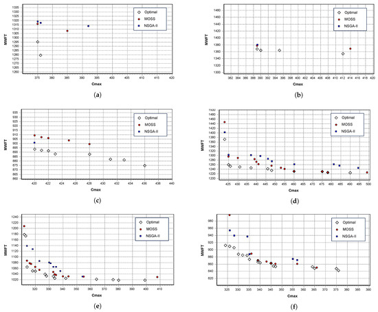 To illustrate detailed results for the small-sized test instances, Figure 10 shows the generated set of non-dominated solutions by both metaheuristics for six selected instances, along with their optimal Pareto front solutions. The Figure 10a–f are ordered in ascending order for the number of optimal Pareto front solutions of the instance, as reported in Table 5. Even though these results were recorded for only one run of each metaheuristic with a computational time limit of 120 s, they reflect the true performance of both metaheuristics that complies with the reported mean results in Table 5 and Figure 9. Based on Figure 10, it is evident that the developed MOSS can generate efficient, non-dominated solutions that are very close to the optimal Pareto front with a better spread and better quality compared to the previously developed NSGA-II.
