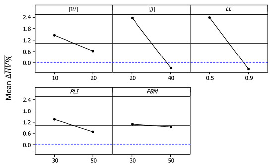 For , Figure 11 shows the main effects plots, while Figure 12 shows the interaction plots. As shown in Figure 11, the mean value of became slightly below 0 at higher and values. Meanwhile, the effect of the other three factors remained in the positive domain despite being significant at 95% confidence, based on the analysis of variance (ANOVA) results. Meanwhile, the interaction plots of Figure 12 show that higher values of combined with higher values of , as well as higher values of combined with higher values of , resulted in larger negative values for the response. Accordingly, it can be concluded that the developed MOSS demonstrated better performance compared to NSGA-II for cases with low and intermediate density, while this situation was reversed for more dense cases.