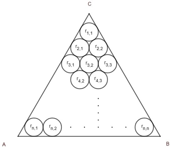 In Figure 2, among these Tn = circles, we define the circles that are tangent to two sides of the triangle as the corner circles and the circle that is tangent to one side of the triangle as the boundary circle. The circles that are not tangent to any side of the triangle are called the inner circles. Note that all problems except Tri(T1) have three corner circles (C1,1, Cn,1, Cn,n) and have 3(n − 2), n > 1 edge circles. There are (n − 2)(n − 3)/2, n > 2 inner circles. It should also be noted that there is no inner circle when n = 1, 2, 3 and no boundary circle when n = 1, 2.
